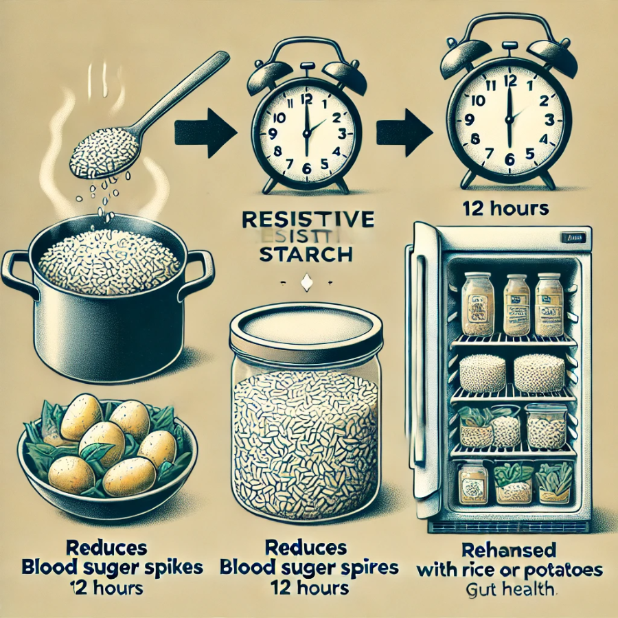 쌀, 감자, 파스타 등 전분 함량이 높은 식품을 조리한 후 식히면 전분 중 일부가 저항성 전분으로 전환됩니다. 저항성 전분은 신체가 소화할 수 없는 섬유질의 일종으로, 혈당을 낮추는 데 도움이 됩니다.