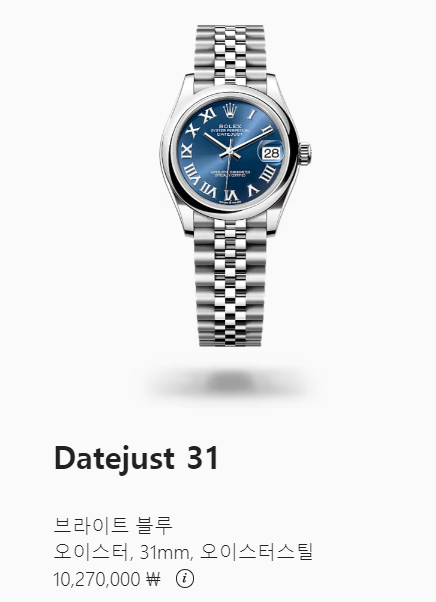 케이스 크기: 31mm 특징: 여성용으로 주로 선호되며, 다양한 다이얼 색상과 베젤 옵션을 제공합니다.