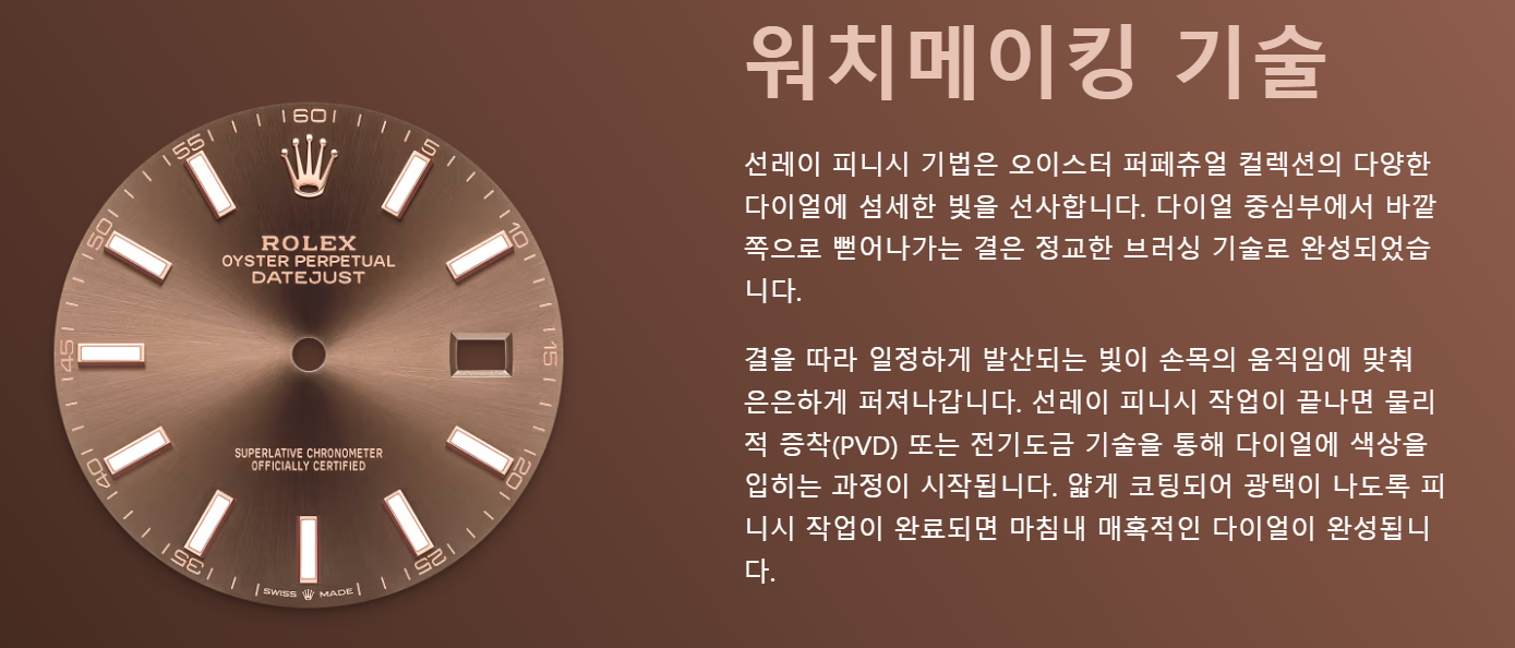 다이얼 : 다이얼 색상과 마감은 매우 다양하며, 다이아몬드 인덱스나 마더 오브 펄과 같은 고급스러운 디테일이 추가될 수 있습니다.