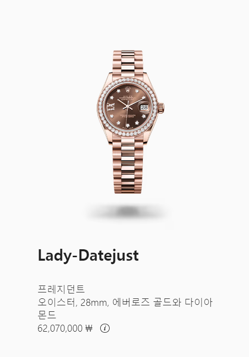 롤렉스 레이디 데이트저스트(Lady-Datejust)는 여성용 시계 중 가장 유명하고 인기 있는 모델 중 하나로, 롤렉스의 전통과 혁신을 결합한 대표적인 시계입니다. 1945년에 처음 출시되었습니다. 데이트저스트는 날짜 표시 기능을 갖춘 최초의 손목시계로 유명합니다. 이 시계의 주요 특징은 다음과 같습니다.