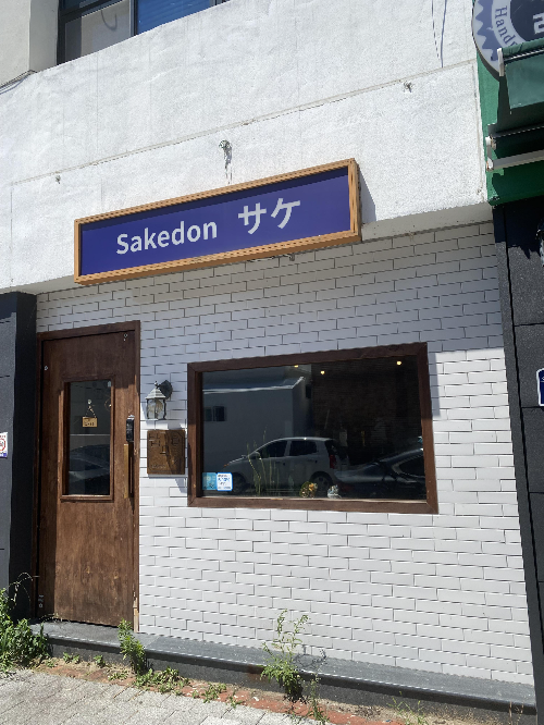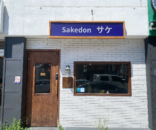 'Sakedon'이라 쓰여 있는 소박해보이는 새파란 간판과 하얀 담벼락의 사케동 맛집입니다.