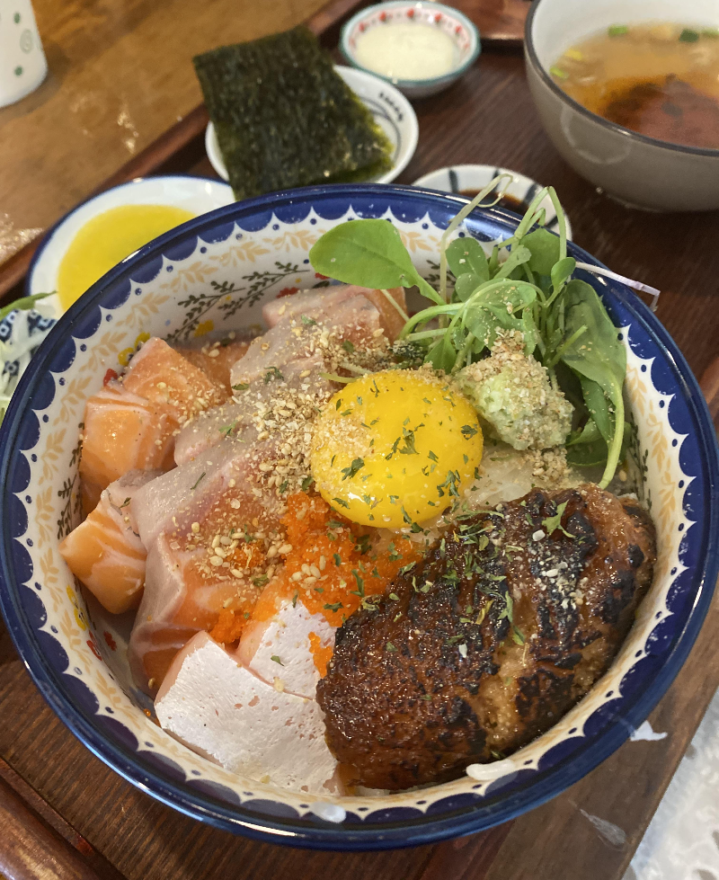 덮밥 오른쪽 아랫부분에 보이는 노릇노릇한 덩어리는 명란마요구이입니다.