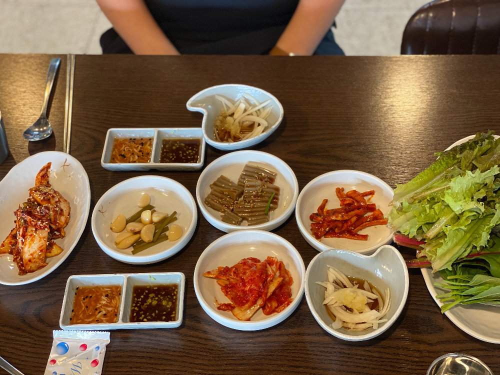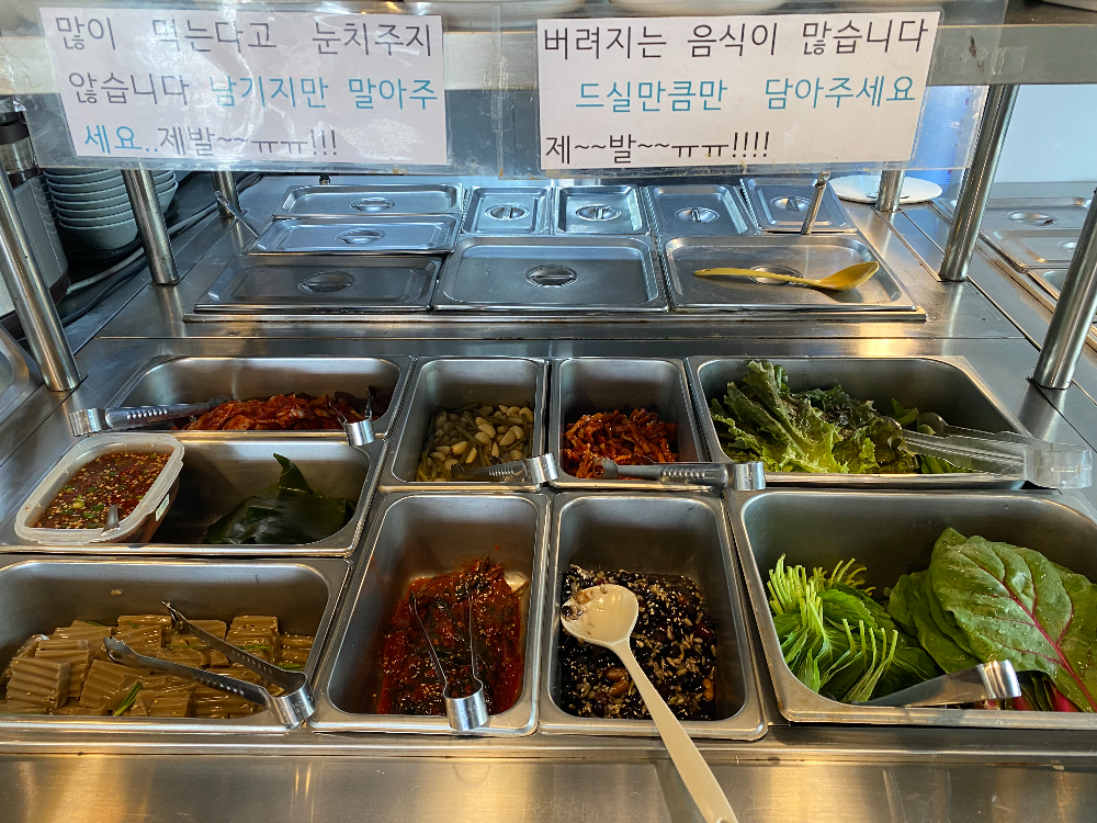 이곳의 또 다른 매력 포인트는 바로 셀프바입니다. 필요한 밑반찬을 셀프로 원하는 만큼 가져갈 수 있는 시스템이 정말 맘에 들었어요. 김치, 콩자반, 장아찌, 묵 등 다양한 밑반찬이 잘 준비되어 있어 반찬 걱정은 안 하셔도 됩니다. 특히 쌈 채소의 신선함도 최고였어요.