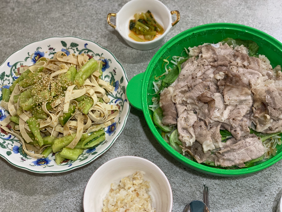 첫번째사진은 오이탕탕이 두부면 국수와 숙주 청경채+ 돼지뒷다리에 소금 후추 뿌려 전자레인지에 찜 해먹은 것이다.