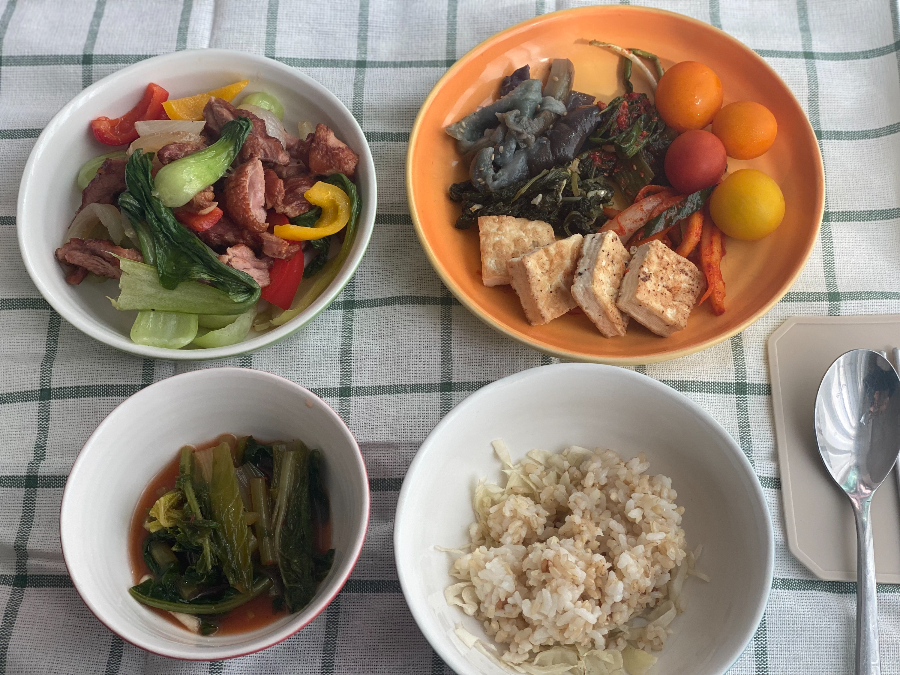 나는 점심으로 고등어를 구워먹거나 닭가슴살에 양배추 + 계란 조합과 샐러드 및 물김치 등의 밑반찬으로 식사를 했다. 밥이 부족할것 같을때는 두부를 마른팬에 고슬고슬 볶아 두부밥을 만들어 먹었다. 원칙은 단백질을 풍부하게, 그리고 포만감들게 먹는것.