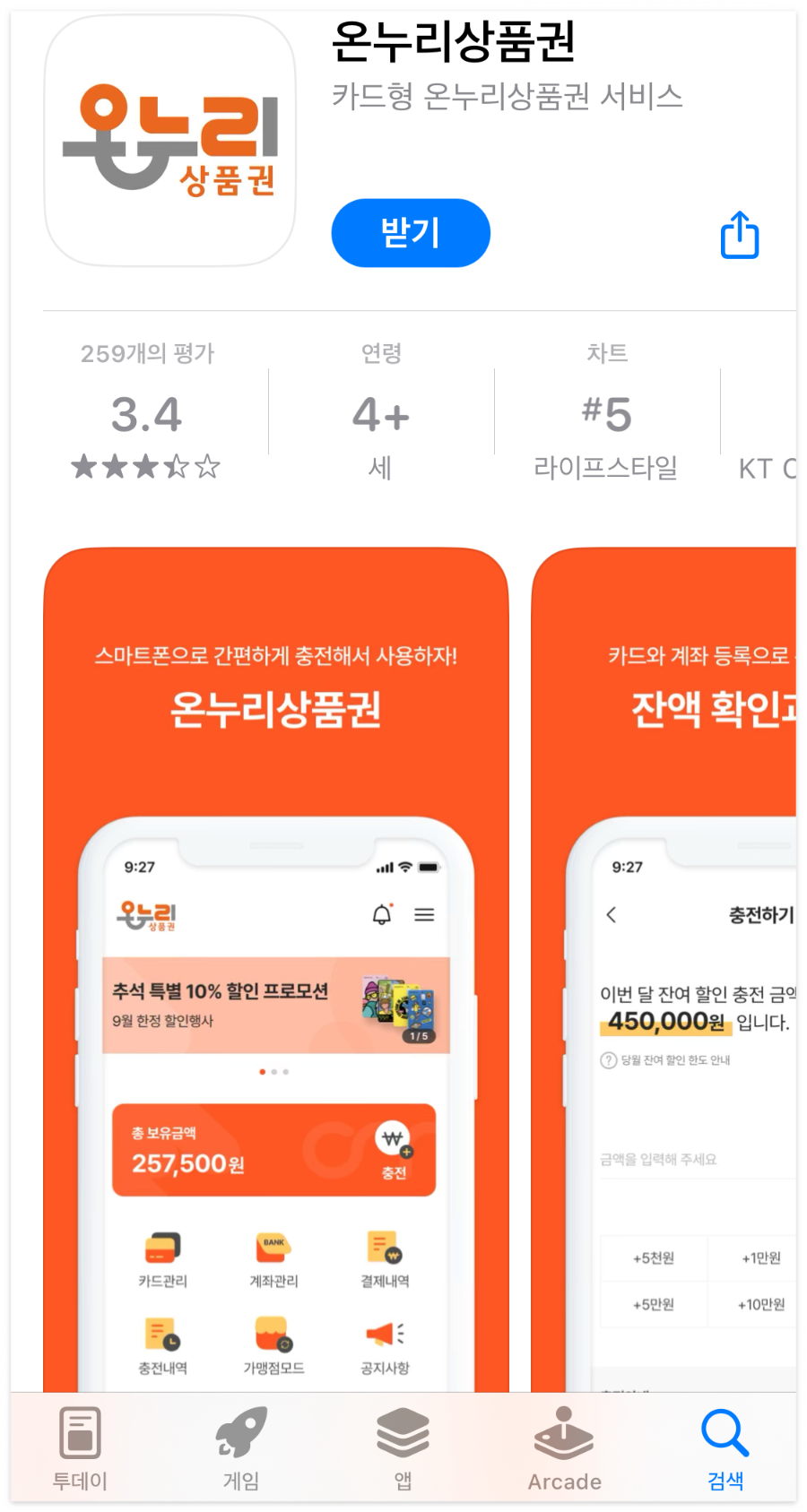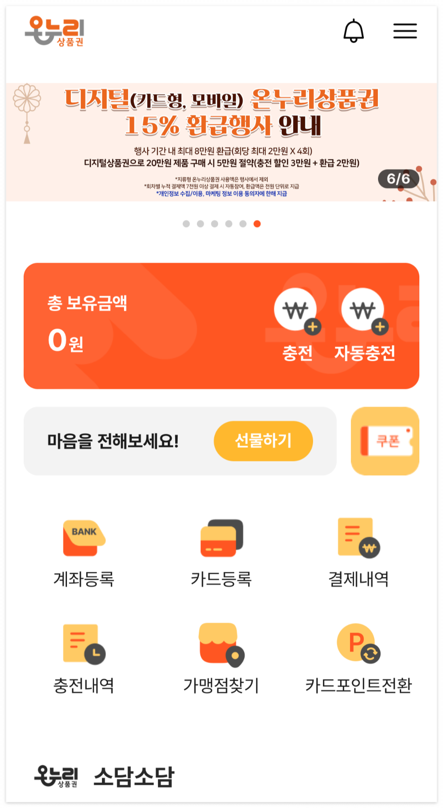 카드형은 기존 신용카드에 충전해서 쓰는 방식인데, 카드형을 사용 하기 위해서는 먼저 온누리상품권 어플을 다운받아주셔야 합니다. 그 다음 어플에서 돈이 빠져나갈 계좌를 연동해 주고, 사용할 신용카드를 선택해서 등록 하시면 됩니다.