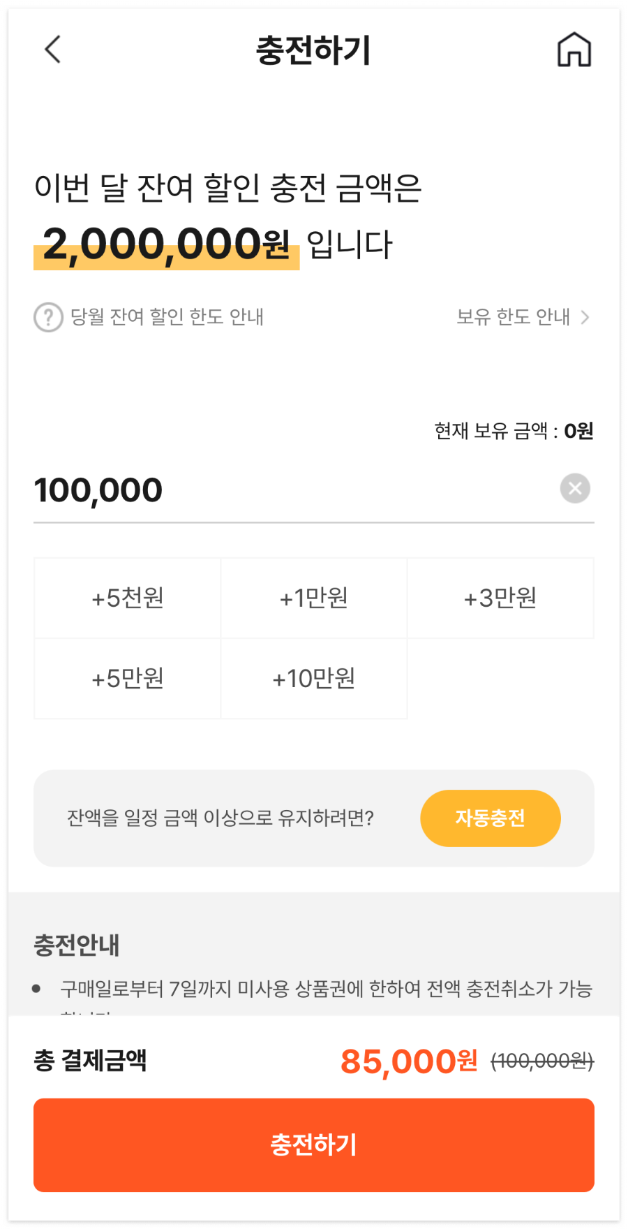 10만원 충전을 누르면 15% 할인 금액인 85,000원이 결제되는 시스템입니다. 즉 85,000원을 결제하면 10만원어치를 쓸수 있게 되는 겁니다. 카드형의 장점은 쓰시던 신용카드 그대로 가지고 다니며 사용할 수 있단 점입니다.