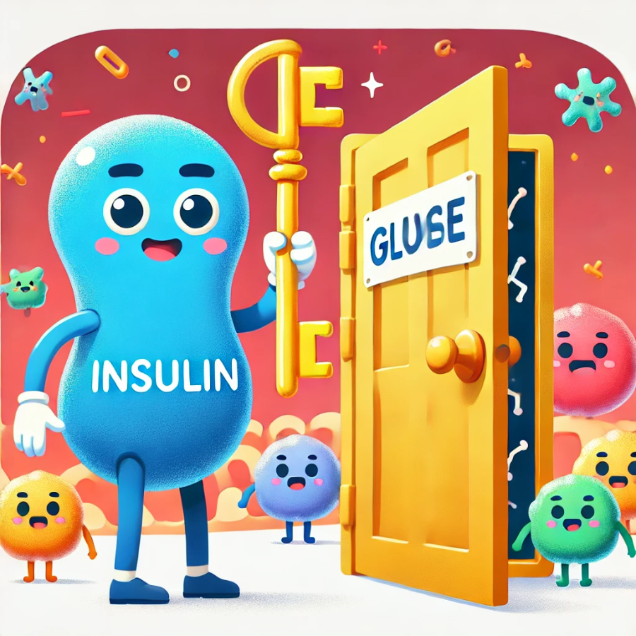 그러나 바로 여기에 문제가 있습니다. 포도당은 스스로 세포에 들어갈 수 없습니다. 문을 열려면 도우미가 필요합니다. 바로 그곳에서 인슐린이 등장합니다! 인슐린은 포도당이 세포 안으로 들어가 에너지를 공급할 수 있도록 문을 여는 열쇠와 같습니다.