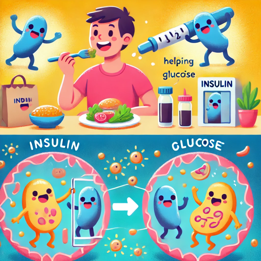먼저 인슐린에 대해 이야기해 보겠습니다. 인슐린을 신체의 친절한 도우미처럼 생각해보세요. 빵, 쌀, 사탕과 같은 음식을 먹으면 신체는 이를 당(포도당이라고 함)으로 분해하여 혈액을 통해 이동합니다. 자동차를 운행하려면 가스가 필요한 것처럼 우리 신체 곳곳의 세포에 에너지를 공급하기 위해 포도당이 필요합니다.