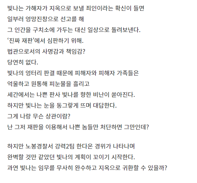 박진표 감독은 도덕적으로 복잡한 주제를 그려내는 능력도 탁월한데, 이는 <지옥에서 온 판사>에서 볼 수 있는 다크 판타지적 요소와도 일치한다. 선과 악의 경계를 탐구하는, 생각을 자극하는 구성를 만들어낸 그의 경험은 드라마의 스토리텔링에 중요한 역할을 한다.