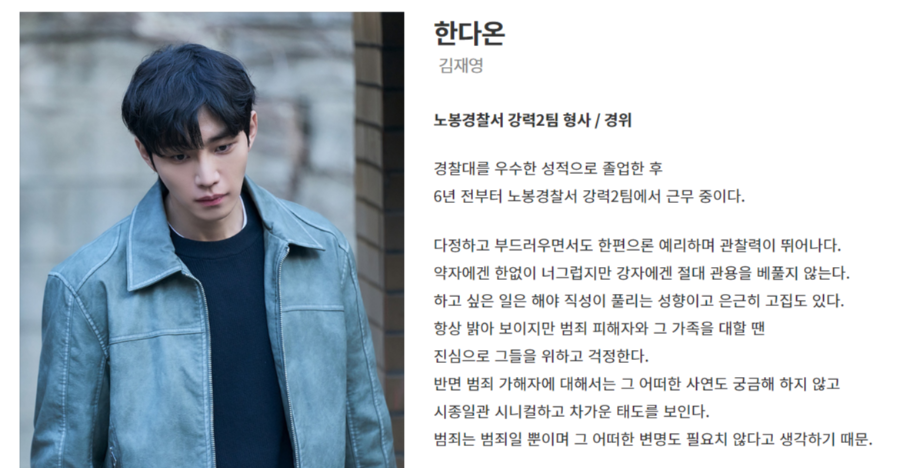그러나 그의 차분한 겉모습 이면에는 그의 캐릭터에 깊이를 더해주는 숨겨진 감정적 고통이 숨어 있다. 형사로서 한다온의 역할은 사건 해결뿐 아니라 강빛나가 인간의 도덕성을 이해하도록 돕는 일이기도 하다.