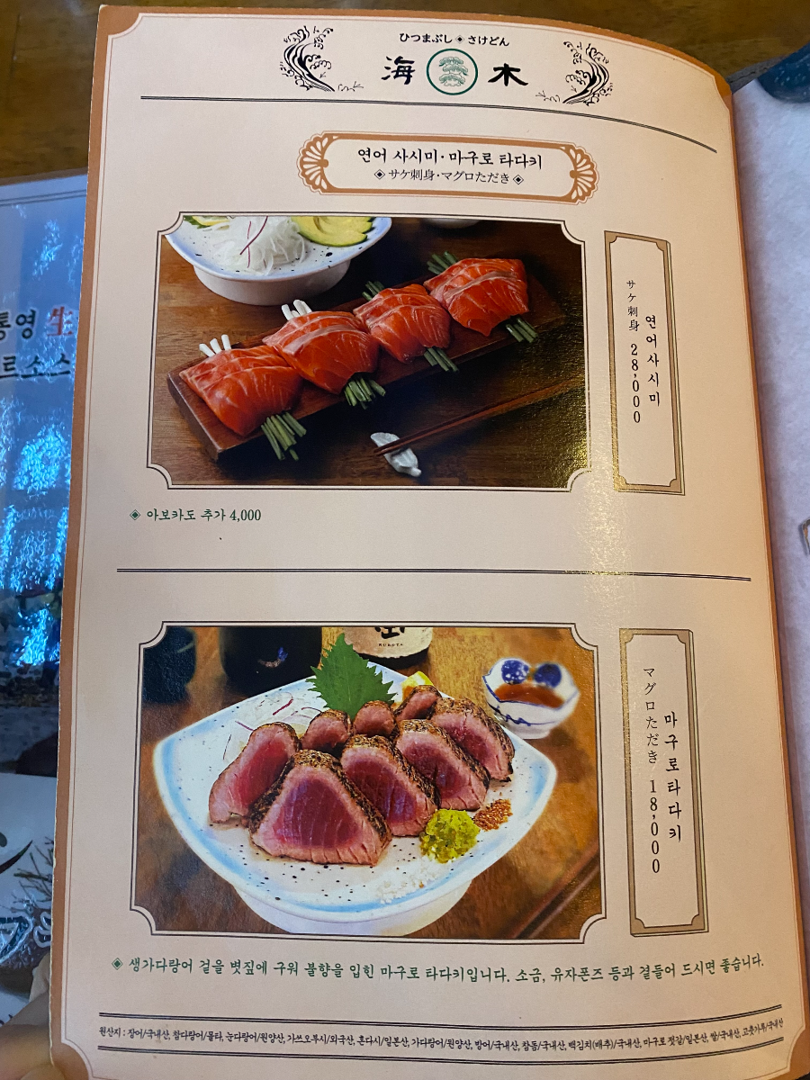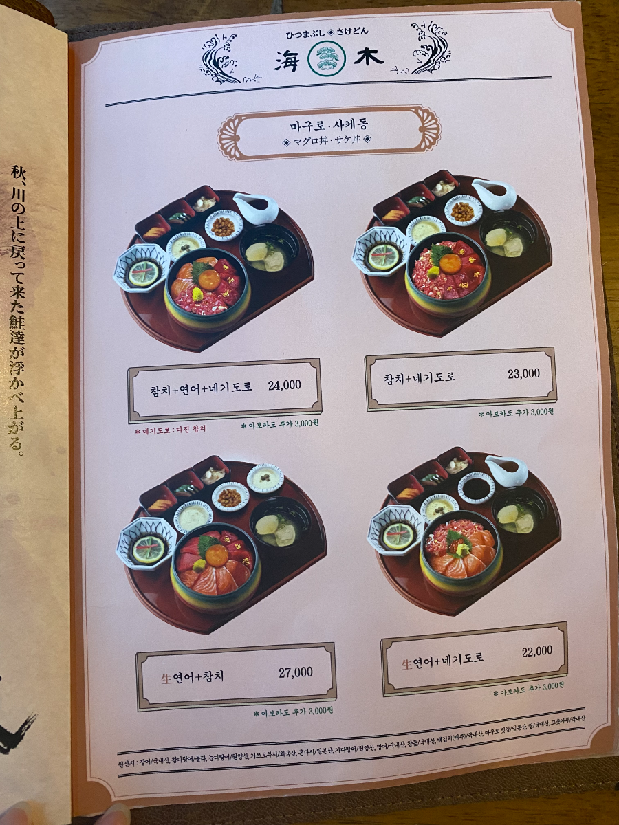 '해목'의 대표 메뉴인 장어덮밥(히츠마부시)와 카이센동입니다.